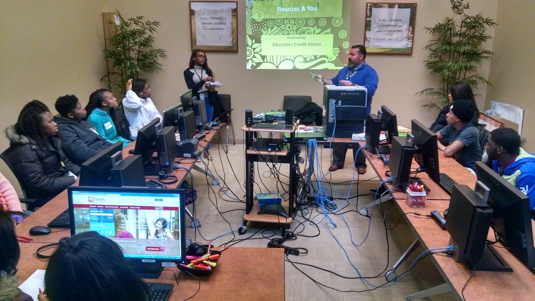 At Educators last week, leaders from the credit union joined our mentor volunteers in an overview of banking basics. Then, students were able to size up debit cards and log-in to an online banking dashboard. Through the door of a functioning credit union, teens were at ease and fired off an array of questions on credit scores and minimum balances, on types of accounts and upcoming savings goals.