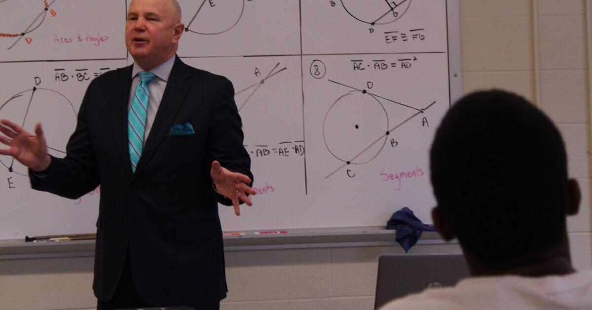 Justus (at left) aimed to reassure Ryan and his classmates that education and careers remain within reach, with the right planning. College debt loomed large in student questions and chatter, a generation very much aware of America’s student debt crisis.
