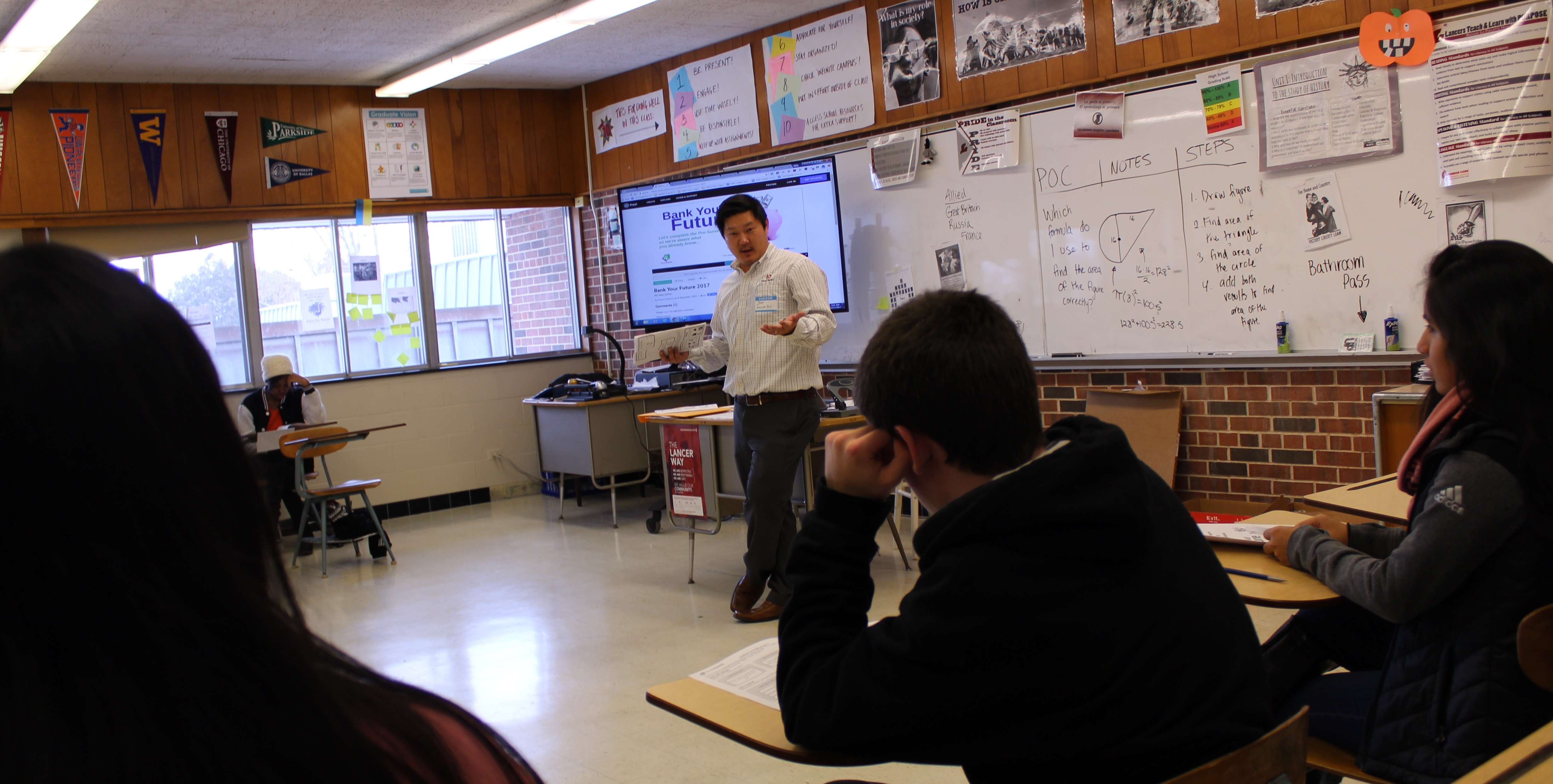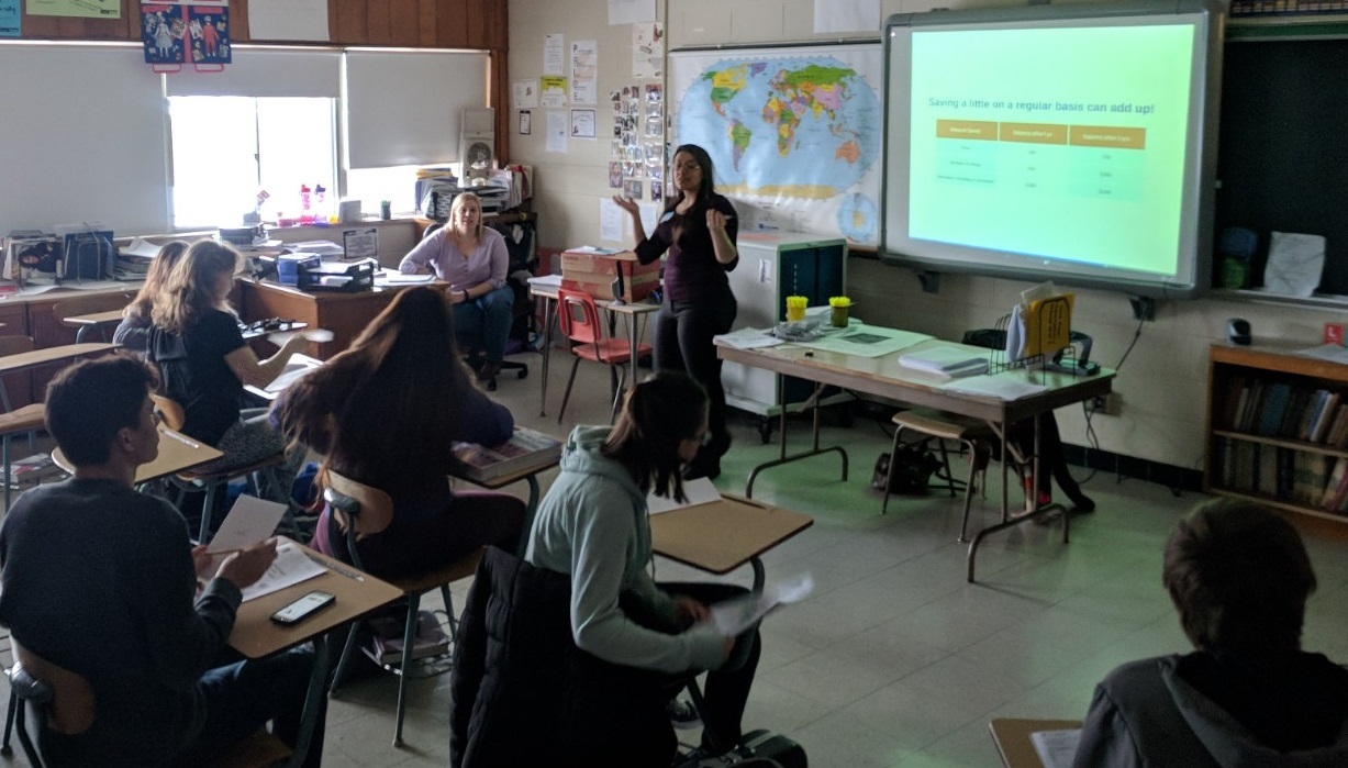 In the classroom of Michelle Roe, a social studies teacher, first-time volunteer Marwah Tamim-Koss, of Park Bank (at right), joined Roe in passing along a few day-to-day bits of personal finance advice to 14 students at the end of their session. Things like tracking expenses regularly and making lists before you enter a store.