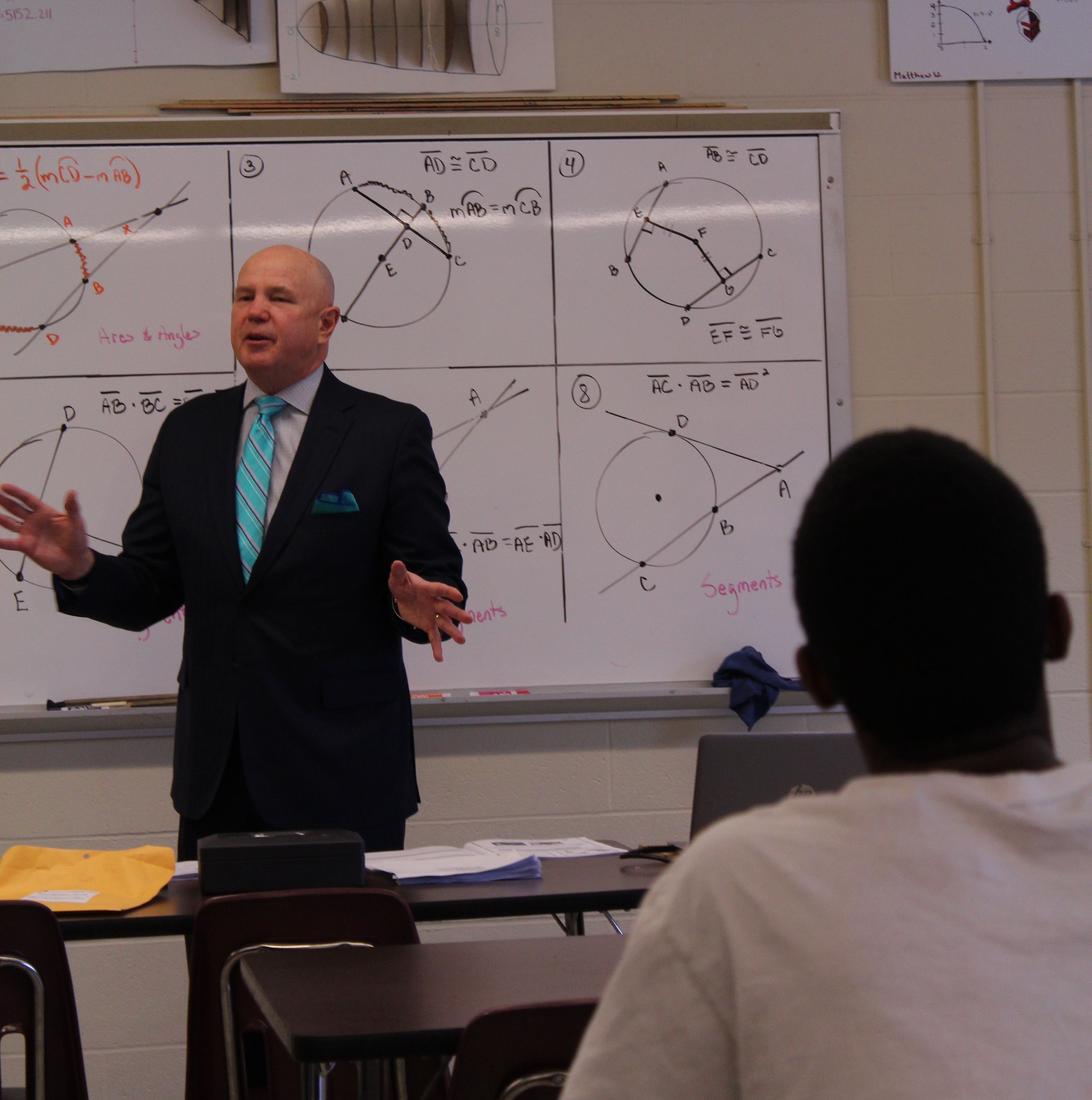 In a three-piece suit, accented with an aqua kerchief, UBS financial advisor Mark Pent (at left) paused during his presentation to high school juniors for a confession.