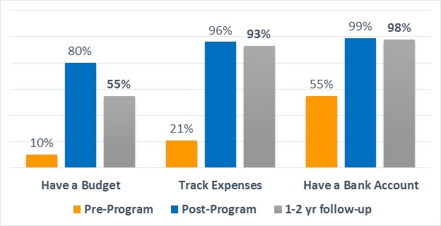 In the first two years of the pilot program there were 120 teens who participated and completed Money Coach, which focuses on small group and one-on-one interactions between specially selected and trained volunteer mentors over the course of nine months. Our longitudinal study features responses from 40, or one-third, of those program graduates, who are all now at or nearing age 20. I believe that the most important indicators for potential lifelong financial capability relate to bank accounts (a place to start), budgeting (having a plan and knowing how you will get there) and tracking expenses (knowing where your money is going). We see extremely high percentages for all three indicators at the conclusion of the nine-month program, but we needed to know if our participants would maintain this activity for an extended period of time and without the regular support of their money coach. I am thrilled with the outcomes of the longitudinal study. All three indicators remain very high and that means what these young adults learned two and three years ago has stuck, and that the budgeting and tracking habits they developed in the program have become longer-term behaviors. (See the figure below)